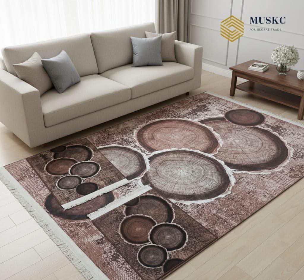 Design Sophistiqué : Une réinterprétation moderne du style naturel. Ce modèle se distingue par son motif audacieux de cercles concentriques organiques qui imitent le bois véritable. L’harmonie des nuances de marron et de beige crée une profondeur visuelle relaxante, faisant de ce tapis un choix parfait pour ceux qui recherchent une décoration originale, chaleureuse et résolument contemporaine.