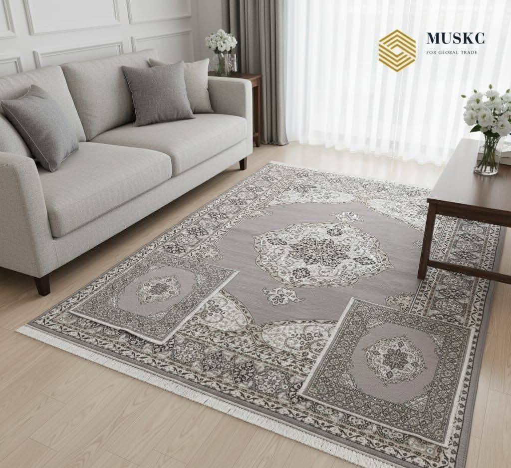 Design Sophistiqué : Un raffinement moderne qui revisite les codes classiques. Cet ensemble se distingue par son médaillon central floral et ses bordures ornementales ciselées, le tout harmonisé dans une palette de gris argenté, d’anthracite et de noir. Un style sobre et prestigieux qui s’intègre parfaitement aux intérieurs contemporains et chics.