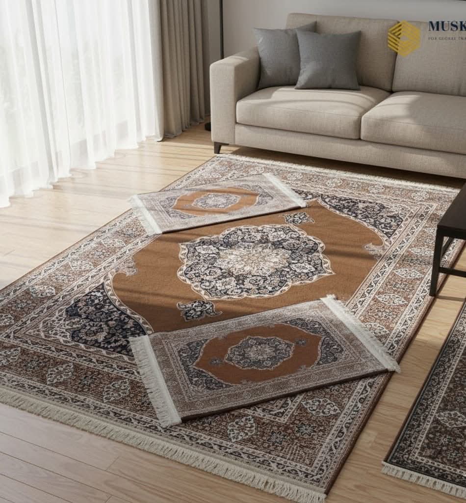 Design Sophistiqué : Une élégance intemporelle qui capture l’essence du style oriental. Ce modèle se distingue par son médaillon central majestueux et ses arabesques florales ciselées, le tout harmonisé dans une palette chaleureuse de brun terre, de beige et de crème. Un design prestigieux qui apporte une atmosphère accueillante et raffinée، s’adaptant parfaitement aux décors classiques comme aux intérieurs plus sobres.