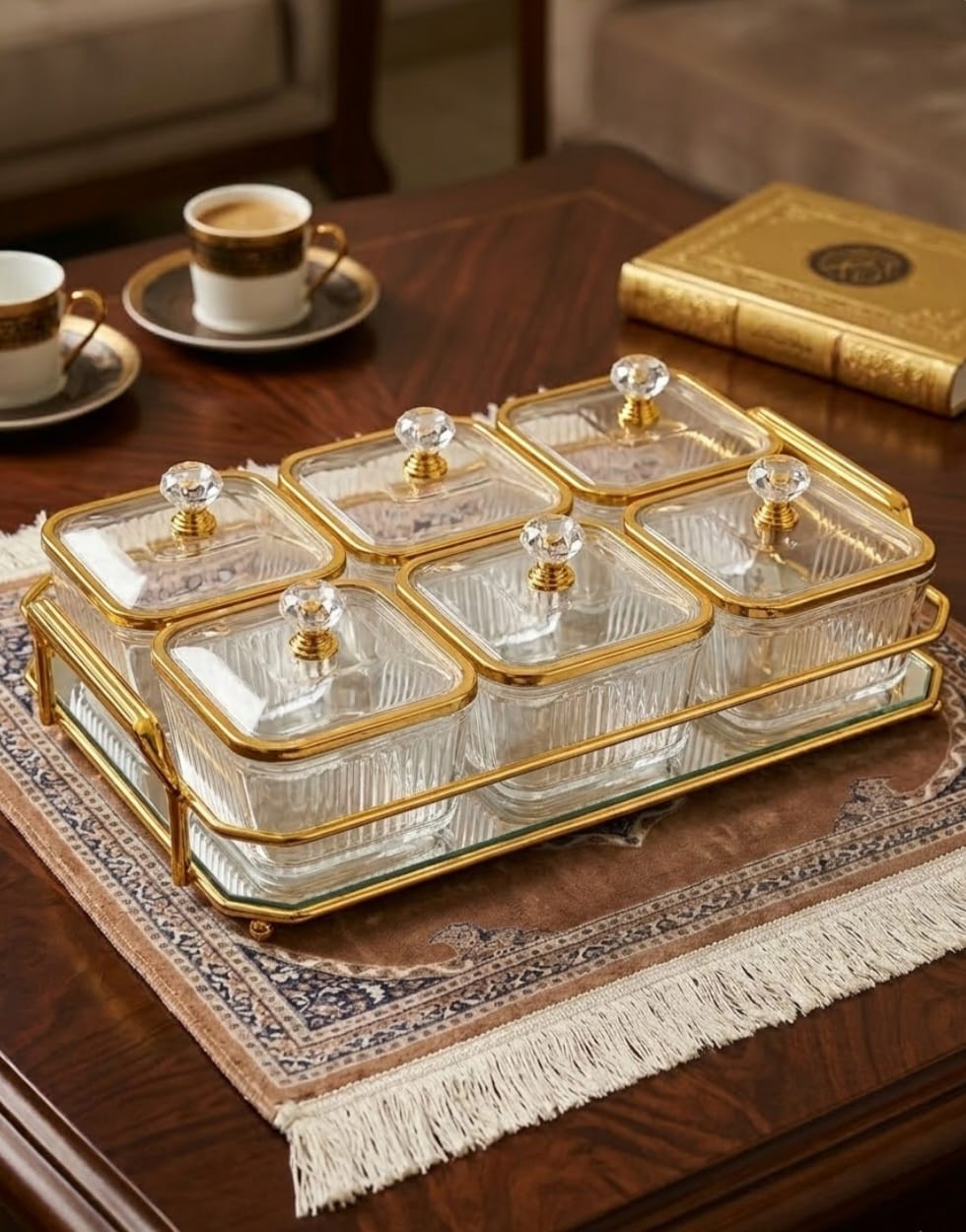 Les Six coffrets qui accompagnent le plateau sont fabriqués en verre cristallin rainuré, offrant une clarté exceptionnelle. Surmontés d’un bouton de couvercle en forme de diamant, ils protègent vos douceurs tout en les exposant comme des bijoux. Que vous y placiez des dattes fourrées, des chocolats fins ou des pâtisseries artisanales, leur aspect sera sublimé.